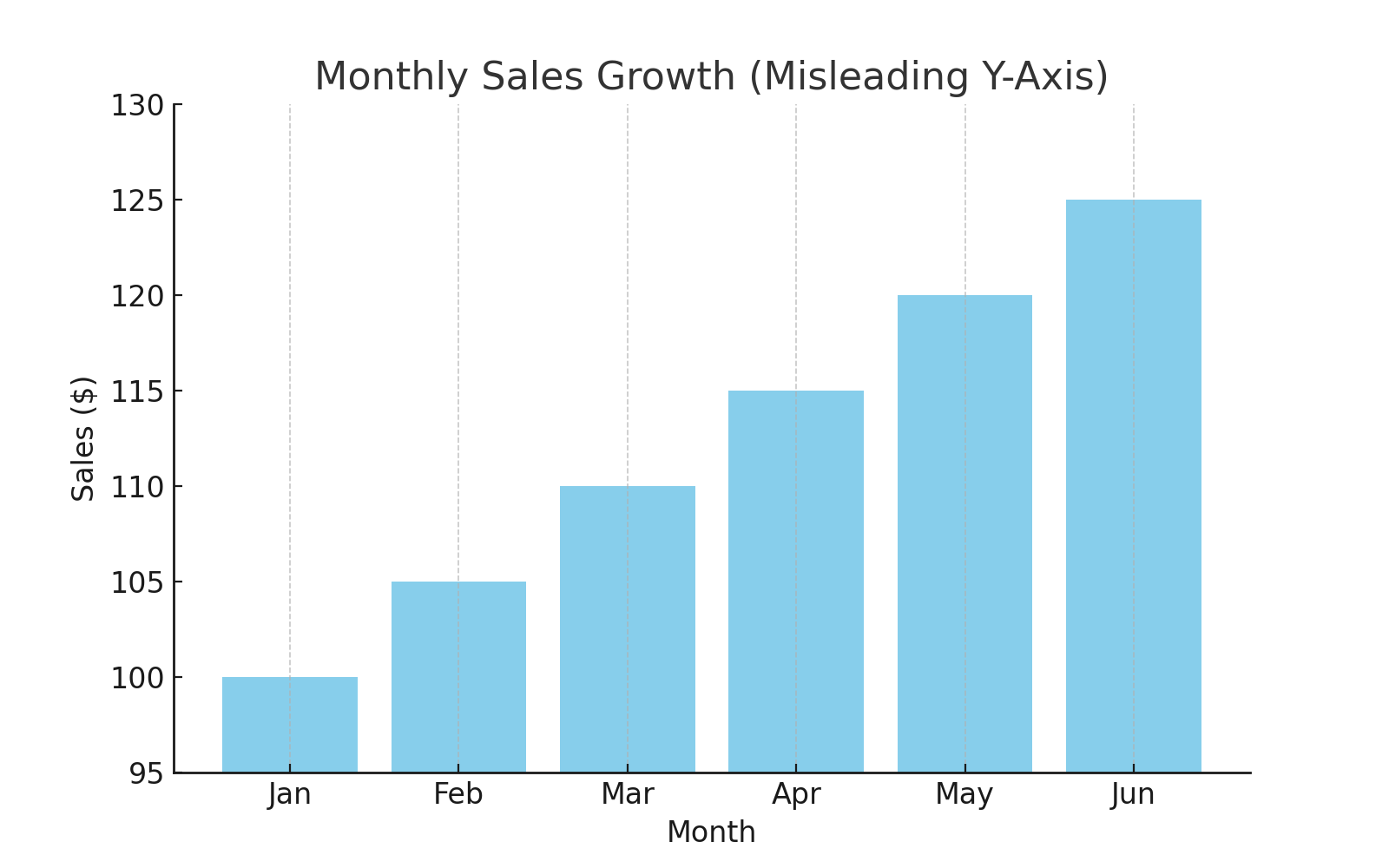 In general, a graph should start at zero on the y-axis (the up-and-down line on the left). If it doesn't, it can mislead the reader regarding differences in categories/variables. For example: