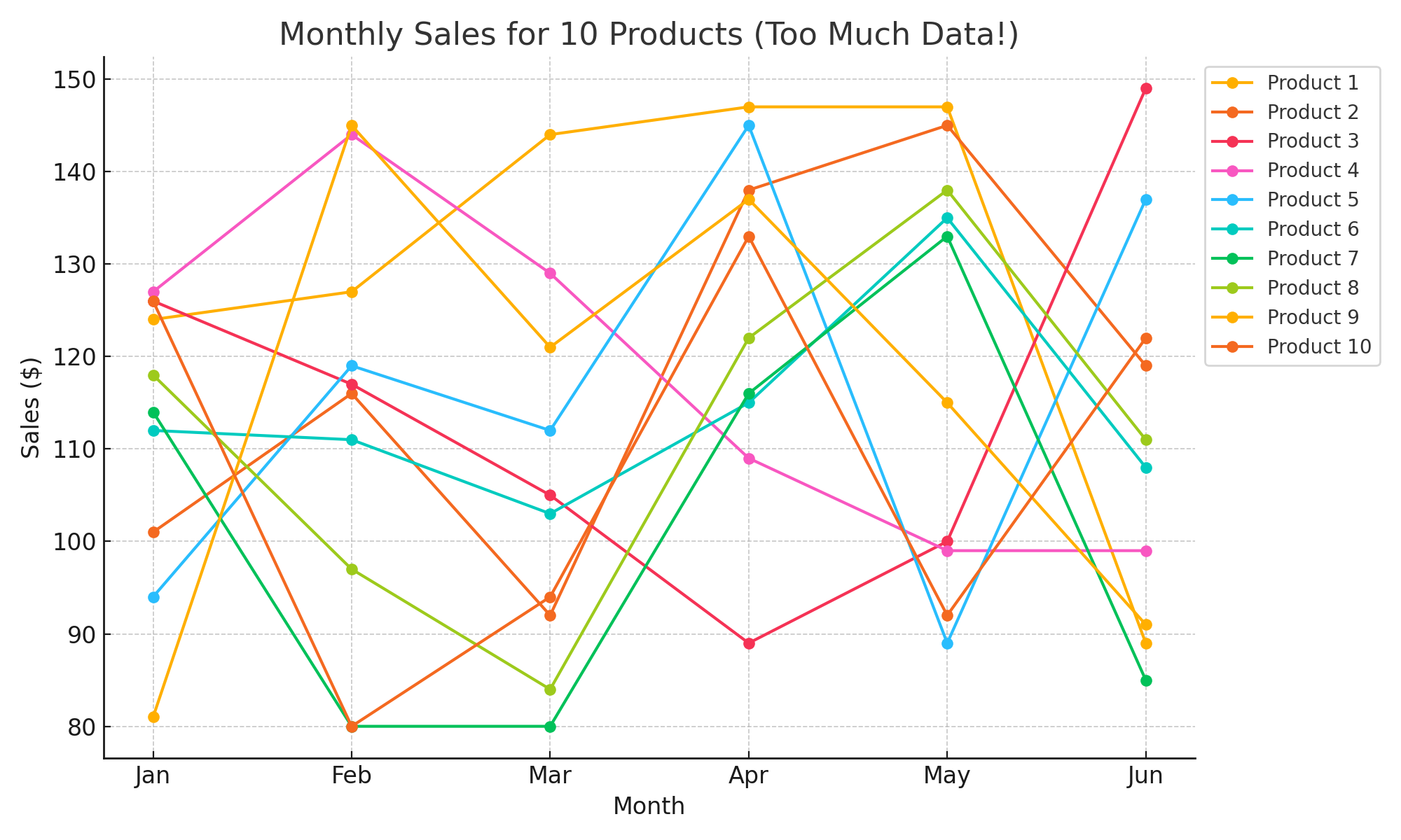 The point of a graph is to quickly convey information about a variable. If we add too much data, though, we can confuse and mislead the audience: